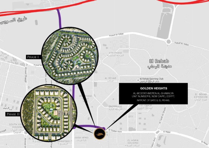 Golden Heights Compound 1, 2 luxury residential compounds based in New Cairo to those with good taste, they’re complete finishing complexes ready for key delivery immediately, Golden Heights landmark location beside Al Rehab City in front of gate number 9 in the first assembly makes it ideal. The first stage consists of 132 Villa Super Lux and the second stage consists of 58 Villa Super Lux. The compounds were built on an area of about 10% of the land area, 52 acres, the rest are trees and landscapes. The Golden Heights Towers include a private club for Golden Heights residents. Golden Heights also has community health care facilities and meeting facilities for owners, as well as commercial and entertainment buildings such as restaurants and cafés.